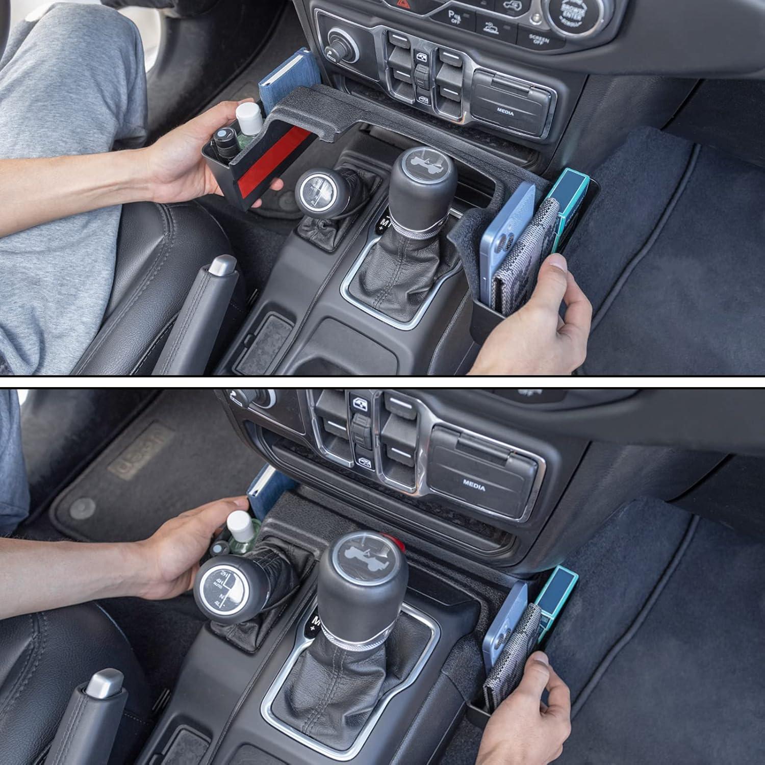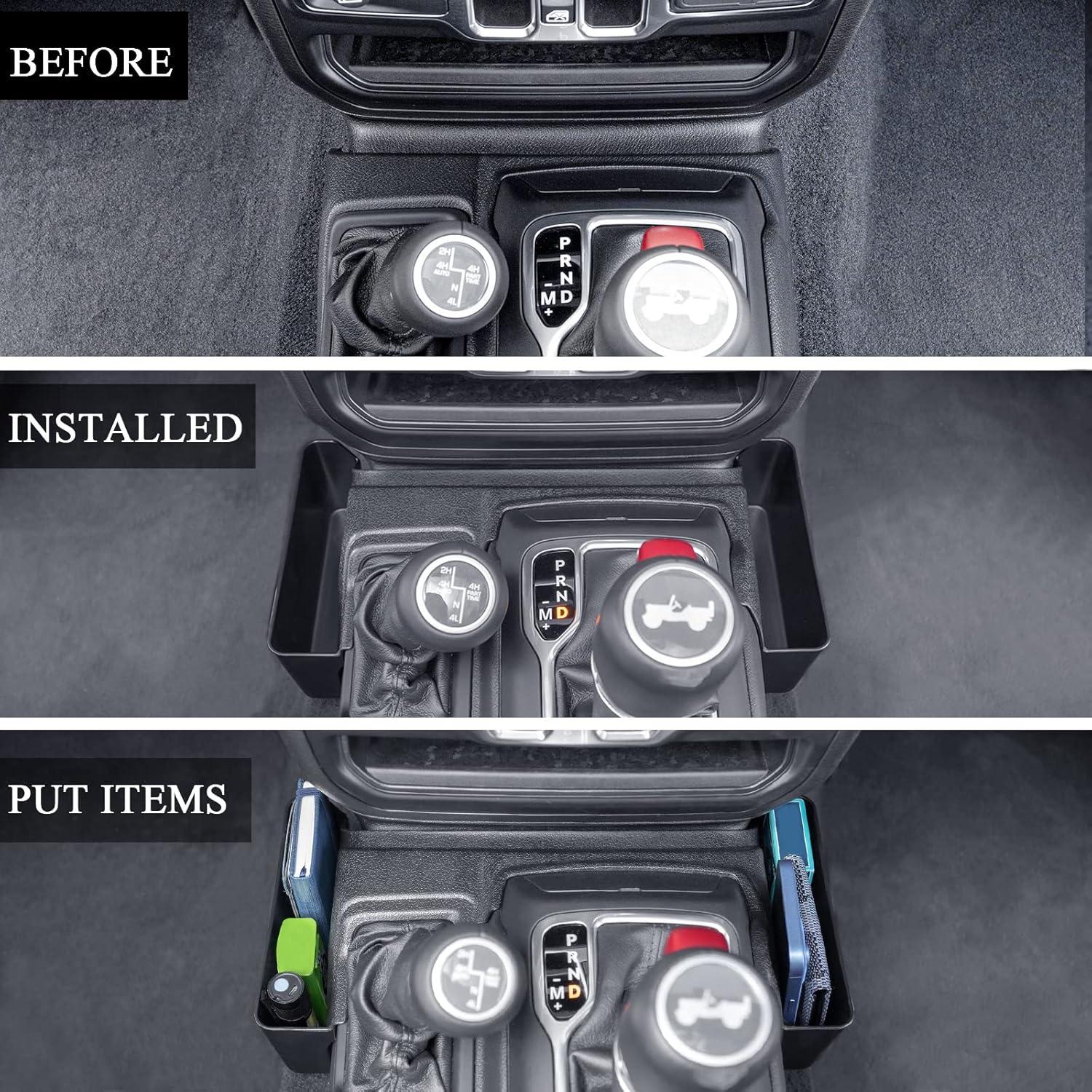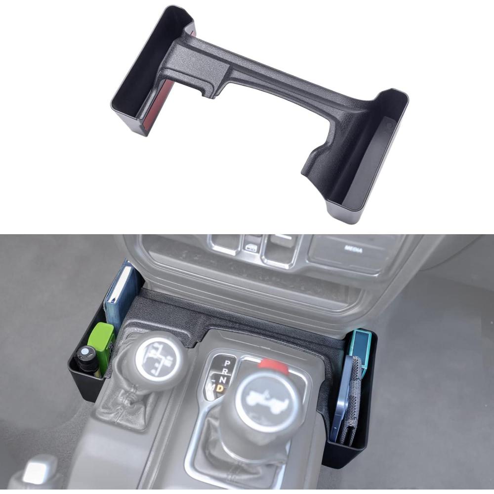 APPLICATION: The gear shift storage box fits 2018, 2019, 2020, 2021, 2022 2023 2024 2025 Jeep Wrangler JL/JLU; 2020, 2021, 2022 2023 2024 2025 Gladiator JT 2/4 Door. Unlimited and 2 doors, including Rubicon, Sport, Sahara, Moab.