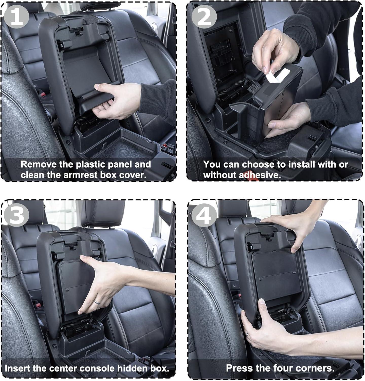 【Easy to install】The hidden box has a snap design and four double-sided adhesive tapes on the back. You can choose to use it with or without adhesive. No need to use other tools or disassemble the armrest box during installation.