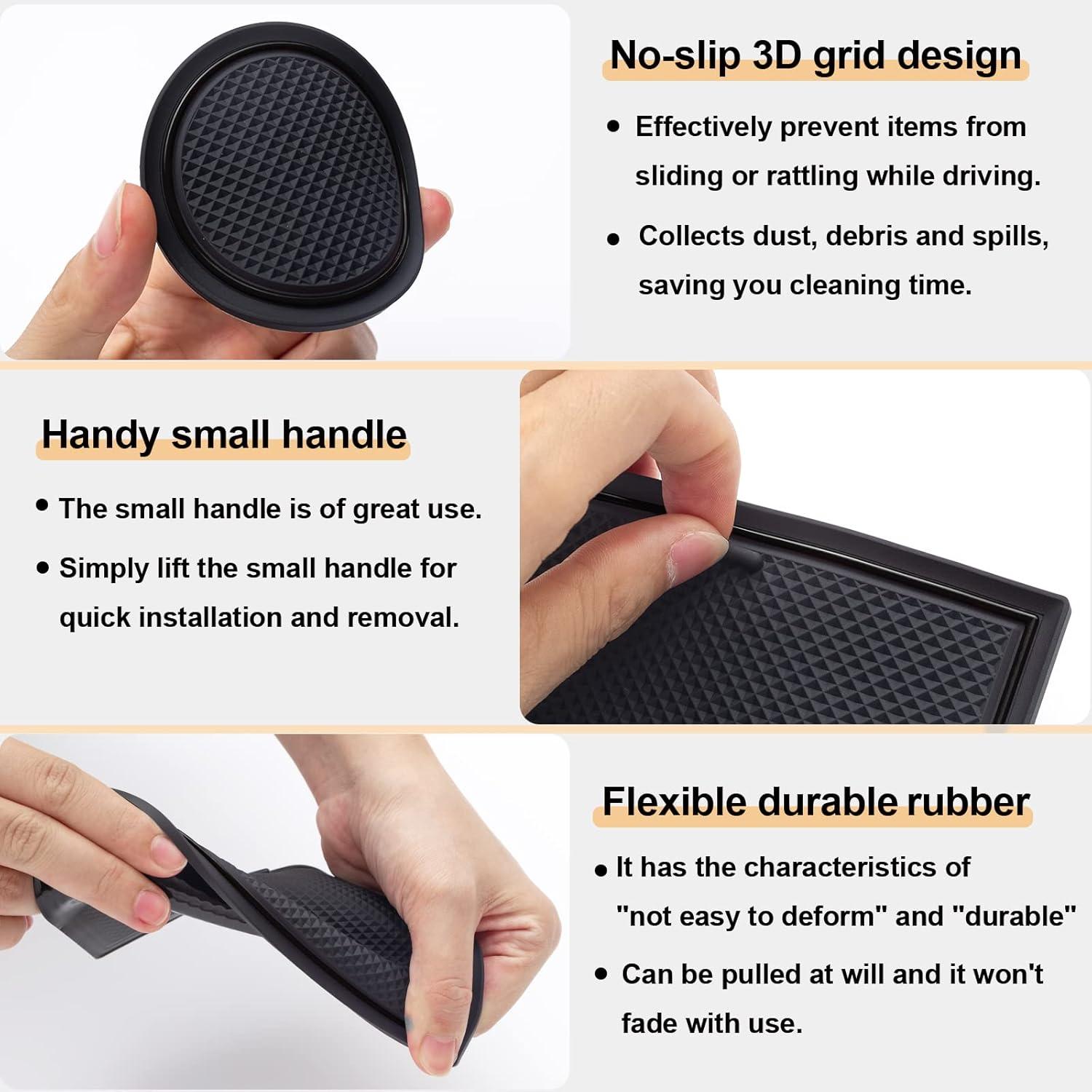 【EFFECTIVE ANTI-SKID】: The surface of the mats is designed with a 3D grid, which can effectively prevent the placed items from sliding or rattling during the driving of your car. The raised edge design effectively collects dust and spilled coffee, protecting pockets from spilled drinks, melted candy, scratches, and rattling coins.