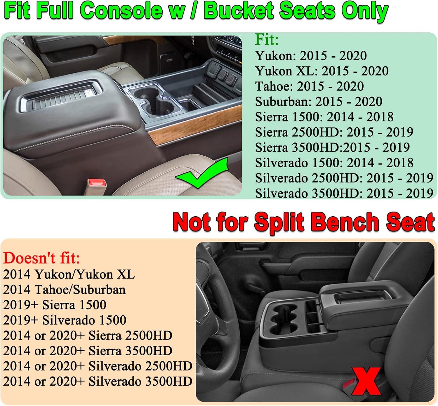[FITTMENT]: The center console organizer fits for 2015-2020 GMC Yukon; 2015-2020 GMC Yukon XL; 2014-2018 GMC Sierra 1500; 2015-2019 GMC Sierra 2500HD; 2015-2019 GMC Sierra 3500HD; 2015-2020 Chevy Tahoe; 2015-2020 Chevy Suburban; 2014-2018 Chevy Silverado 1500; 2015-2019 Chevy Silverado 2500HD; 2015-2019 Chevy Silverado 3500HD. Only fits full console with bucket seats. Not for split bench seat