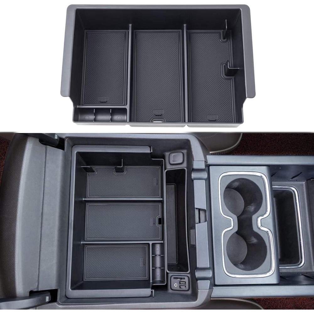 [FEATURES]: Divide the armrest box into upper and lower layers, increase the storage space. The upper layer can put phone, wallet, sunglasses, and coins, and the lower layer can put repair tools and masks. Easy to organize and store items.