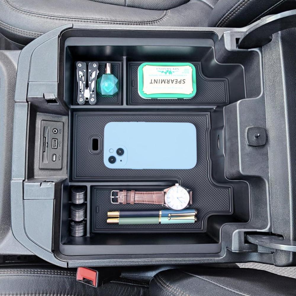 【Convenient design】 Included cut-outs for the light and the USB, you can still see needed items at night and charge your phone when you need it. Here are no-slip rubber liners for each compartment to prevent items from making noise and sliding around